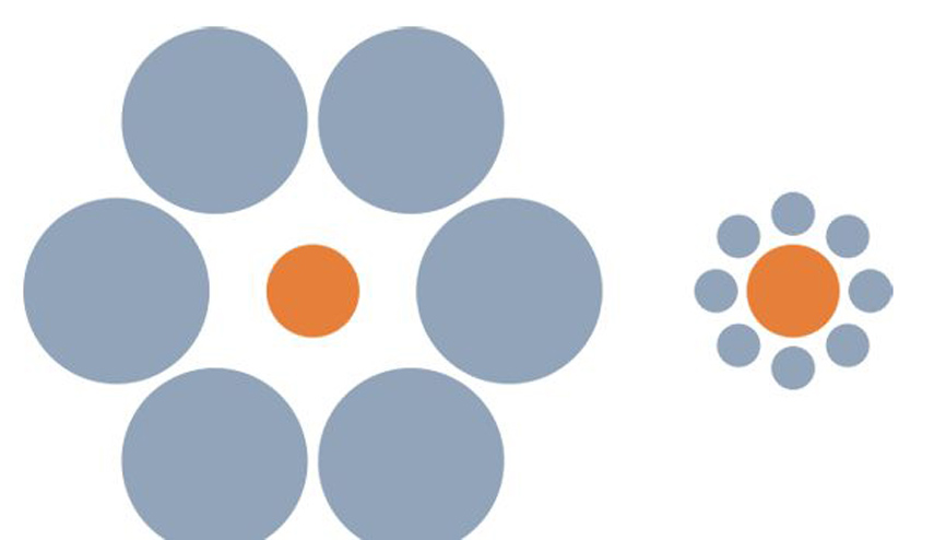 比如這幅圖,你覺得左邊和右邊中心的橙色圓圈哪個更大?